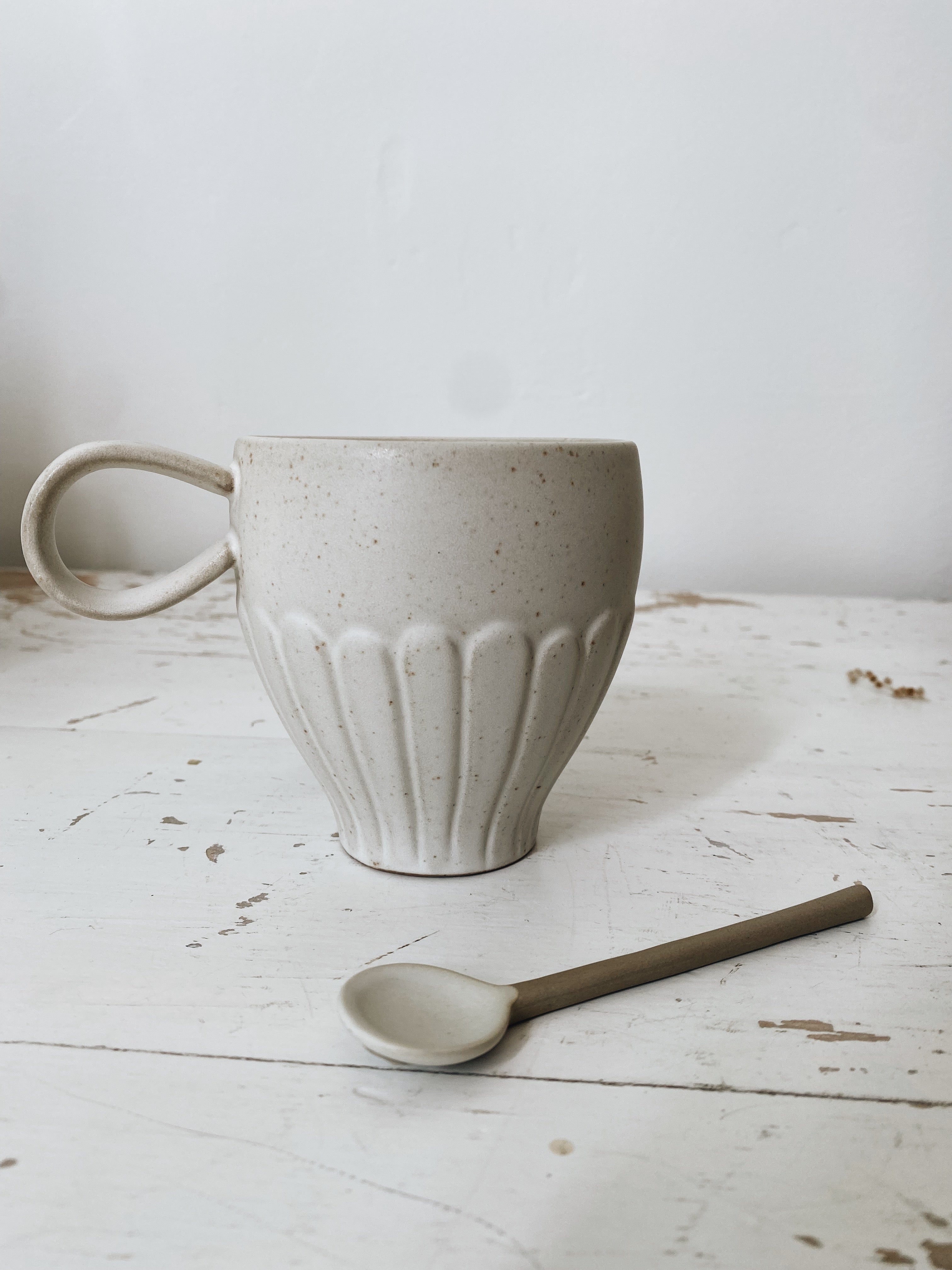 Materials & Composition: Handmade from stoneware with a creamy warm glaze and delicately looped handle.