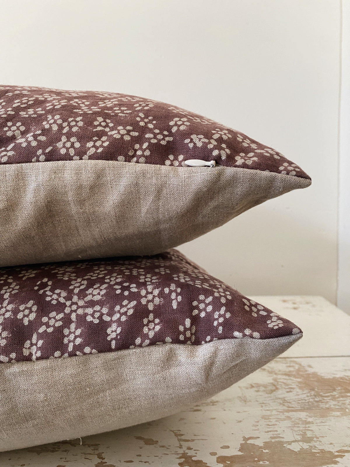 Features an invisible zipper and knife-edge finish for a sleek, refined look. Each cover is handmade, ensuring unique artisanal quality.