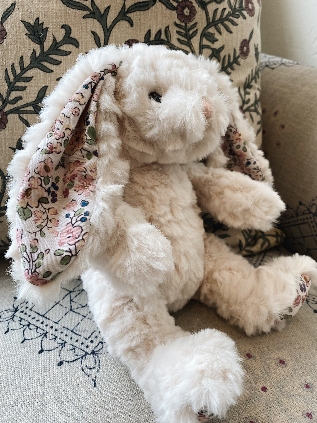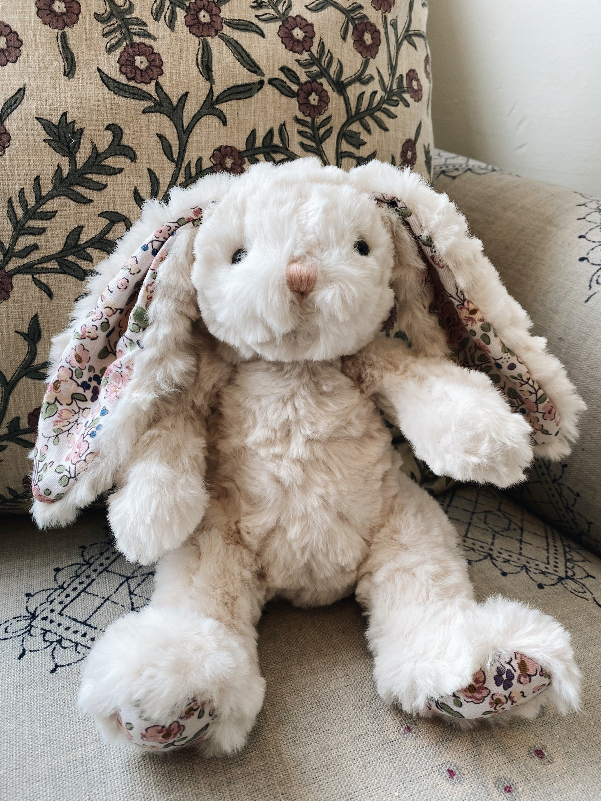 An heirloom plush bunny, in soft novel fabric with French inspired floral print. Incredibly soft and irresistible to the touch! A classic for Easter or any day of the year.